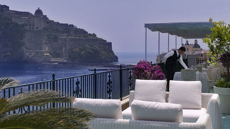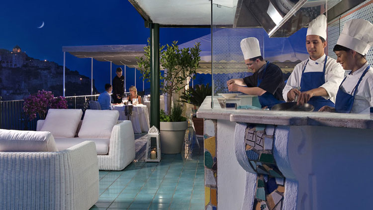 Per chi, durante il girono si reca nella spiaggia privata dalla sabbia sottile, l’hotel mette a disposizione un bar per spuntini e bevande fresche direttamente sotto l’ombrellone. A fare da sfondo per l’aperitivo, invece, oltre agli infuocati tramonti ischitani, è la rocca del Castello, con i suoi mille riflessi dorati.